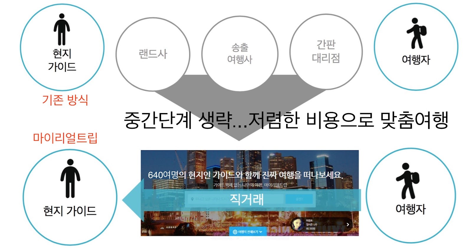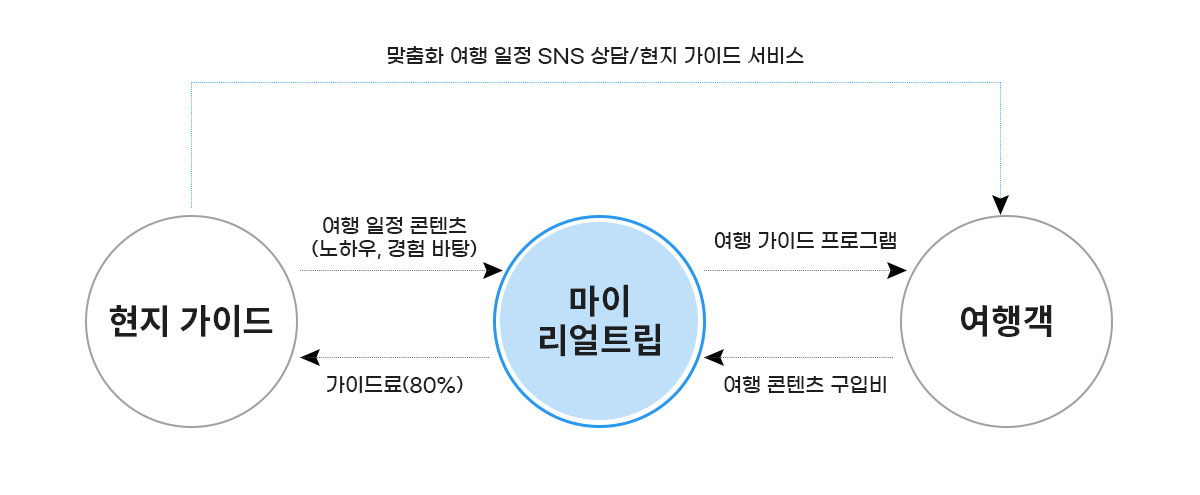 마이리얼트립이 여행 산업에 패러다임을 불러왔다는 이야기 중 가장 큰 영향력을 보이는 부분이 바로 '수익 구조'다. 기존 여형사 시스템은 현지 가이드와 여행자를 연결해 주는 과정에서 수많은 중간 유통업자가 생기며 자연스럽게 소비자가 비용 하는 부담을 증가했다. 이런 여행 서비스 구조에는 새로운 변화가 필요하다고 생각했고 현지 가이드와 직접 컨택하여 여행자에게 연결해 줌으로써 좋은 가격 경쟁력을 가지게 되었다.